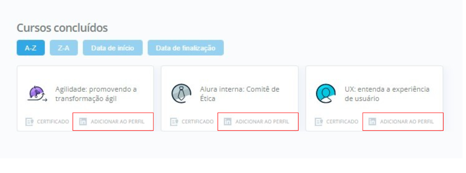 Ao descer a tela, você verá seus “Cursos concluídos”. Ali, você poderá acessar os certificados dos respectivos cursos clicando em “Certificado” ou adicionar o certificado diretamente ao LinkedIn em "Adicionar ao perfil":